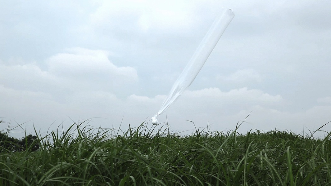 JC: 這個氦氣球其實就是南韓某些民間組織用來發散傳單到北韓用的那一種,這些組織都極右,他們在南北韓停戰線邊發散這些批評北韓,讚美資本主義,這些氣球停靠的時間地點被很多不同因素左右者: 上面綁的計時器,天氣,風速還有風向——總之不受人為控制。但那些放氦氣球的人希冀氣球會停靠他們心中所想的地方。這好像一種現代主義的前進式的思考方式: 有一個既定的目標。這個影片分為兩個部分: 第一部分提出一個問題,第二部分重點在氣球本身,在第一部分,畫面上有一綁著傳單的氣球直線前進,這些傳單的重量防止氣球被風吹走。在第二部分, 氣球不再攜帶傳單,沒有重量限制它自由地在首爾上空漂浮,好似去掉所有意識形態了一樣,它跟著風飛翔,沒有一定的終點,我覺得這些傳單代表了我們這個世代面臨的政治壓力。